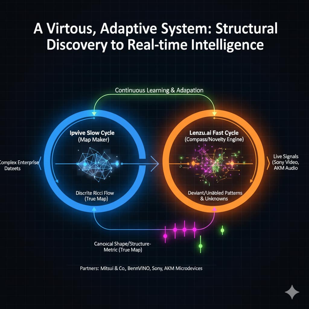 - Internal Flywheel: Deploy the Ipvive Slow Cycle on Mitsui & Co.’s data to discover our first enterprise shape/structure-metric. Then, deploy the Lenzu.ai Fast Cycle to validate its real-time value.